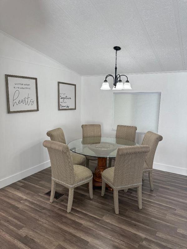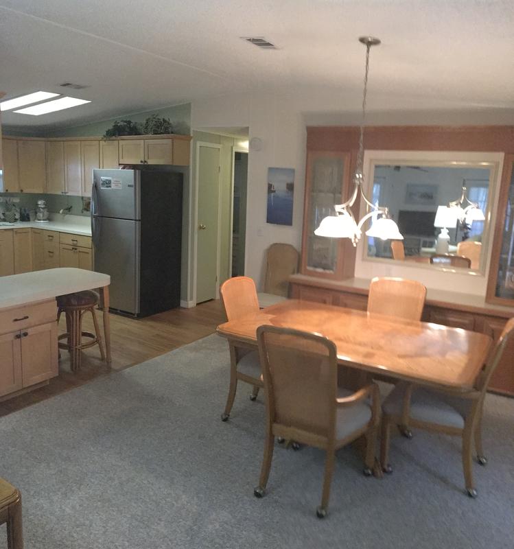 GREAT LOCATION BY POOLS AND AMENITIES. Private back yard with deck. Impeccable Home Beautifully Furnished Freshly Painted Thru out. Great Open Floor Plan Full Dining Room Open to Large Living room. Island Kitchen all Appliances included. Laundry room With Washer Dryer. New Metal Roof and Windows . Extra Large Side Porch With Huge Back Deck. Large Storage room and Includes Golf Cart. Master Bedroom Has Master Bath Large Closets and Lots of Storage . Lot Rent Includes use of Clubhouse and all Amenities lawn cut, edging. Show less