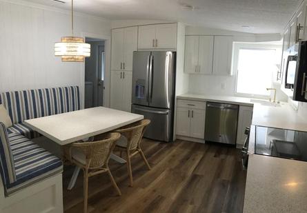 Kitchen Has New solid wood White Shaker Cabinets solid surface counter tops. All new stainless steel GE Smart Appliances. Custom built Breakfast Booth With Storage, Matching solid surface Table top and Custom Made Cushions.
